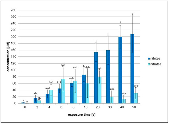 Graphical representation of nitrites and nitrates concentrations measured in reaction mixtures treated by NTP for 2 to 50 s using RPS40 plasma source. Data are presented as mean ± SD. Statistically significant differences in concentrations were determined using LSD ANOVA test at a significance level of p ≤ 0.05. The significant difference between homogenous groups is depicted by a complete variation in the letters. The data are the results of four independent experiments.