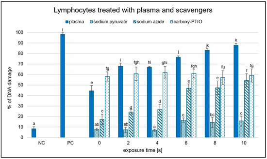 Graphical representation of the percentage of damaged DNA in lymphocytes treated with three selected scavengers and exposed to NTP for 2 to 10 s using RPS40 plasma source assessed by comet assay. NC (negative control—lymphocytes treated with phosphate buffer solution), PC (positive control—2.5 µM hydrogen peroxide), exposure time 0 (solvent control—lymphocytes treated with distilled water and scavenger solution). Data are presented as mean ± SD. Statistically significant differences in the percentage of DNA damage were determined using LSD ANOVA test at a significance level of p ≤ 0.05. The significant difference between homogenous groups is depicted by a complete variation in the letters. The data are the results of at least three independent experiments.