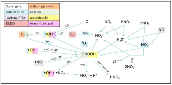 Schematic representation of chemical reactions processes probably taking place in PAW and the elimination effect of the scavenger used. The specific ROS and RNS that are eliminated by a given scavenger are color-correlated. Diffusion of more stable particles (H2O2, O3, NO2, HNO2, HNO3, NO) originating from plasma treatment causes generation of short-lived species in the water (OH and NO radicals, nitrites, nitrates). These short-lived species react with one another and with water molecules, which results in generation of secondary reactive species such as peroxynitrous acid, nitrites, nitrates, and hydroxyl radicals.