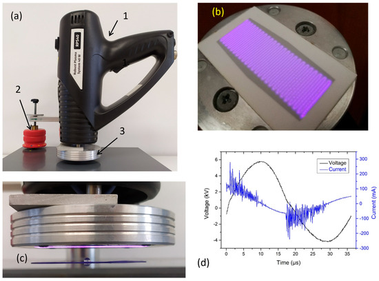The photos illustrating the experimental set up, the general view of the handheld device RPS40 plasma system in the arrangement for the plasmid DNA treatment in the water, where 1—RPS40 plasma system body, 2—vertical holder with micrometrics displacement, 3—plasma head with electrode system (a), the view of the macroscopically homogeneous DCSBD plasma layer generated in ambient air (b), detail of the treatment process with sample position (c), and the time development of voltage and current waveforms in DCSBD generated in ambient air by RPS40 plasma system at input power 40 W (d).