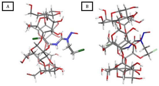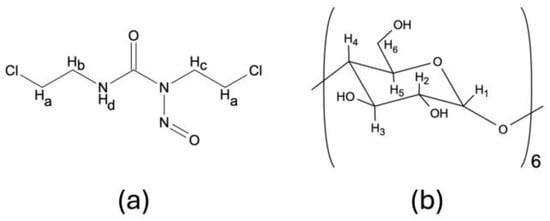 Consequently, the scientific community has focused on developing novel drug delivery systems (DDSs) for BCNU []. Until now, nanoformulations such as liposomes [,,], polymeric nanoparticles [,] and hydrogels [] have been reported. Significantly, the group of cyclic oligosaccharides known as cyclodextrins (CDs) has demonstrated considerable benefits in addressing the challenges posed by the adverse physicochemical properties of pharmaceutical products. The capacity of CDs to create inclusion complexes (ICs) has ushered in a plethora of applications within the pharmaceutical sector. The process of complexation with CDs can be employed to augment various properties of numerous pharmaceuticals, including improvement in stability, partition coefficient, biological efficacy, bioavailability, dissolution rate, volatility, and solubility [,]. CDs comprise α-D-glucopyranose units interconnected by a α-1,4 glycosidic bonds. The distinctive shape of a truncated cone, featuring a central cavity, is bestowed upon CD molecules by the chair conformation of the glucopyranose units. The exterior of CD features hydroxyl groups that provide hydrophilicity, while the interior is relatively hydrophobic, which makes CDs capable of solubilizing various compounds []. Thorough characterization of CD ICs, both in solution and solid forms, is a complex process requiring multiple analytical techniques. The results of these findings must be integrated and assessed collectively [,,].