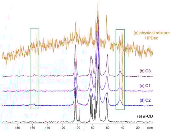In the spectrum recorded using the CP sequence for a physical mixture of α-CD and BCNU (Figure 7a and Figure S3), the signals can be solely attributed to the α-CD. The occurrence of this phenomenon may be linked to the temperature within the rotor, which is in the range of 35–40 °C, a consequence of the fast sample spinning (10 kHz) at the magic angle. As the melting point of BCNU is approximately 31 °C, the polarization transfer is simply ineffective. Nevertheless, the HPDec spectra, despite the lower quality, revealed the BCNU presence. The signals in the range of 150–160 ppm and 40–50 ppm can be attributed to the BCNU molecule. For samples C1, C2, C3, however, the CP sequence is effective for both α-CD and BCNU signals, probably because the complex formation influences thermal stability of the BCNU so that it remains in a solid phase under the magic angle spinning conditions.