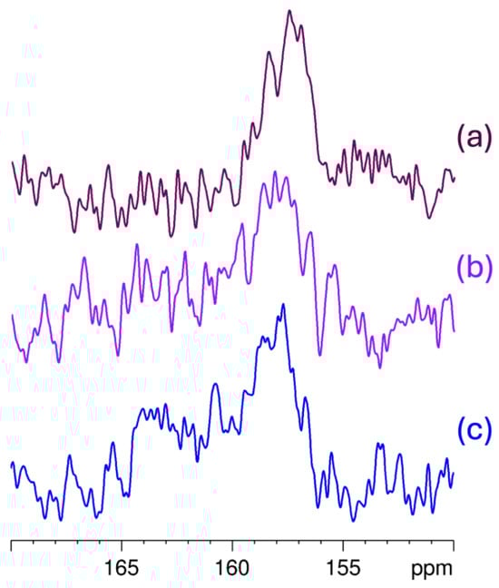 In Figure 7, the BCNU signals are highlighted by the green frame, which also illustrates their shifts, as indicated by the orange dotted lines, when compared to the spectrum of the physical mixture. The signals exhibit a change in width, which is noticeable in the CP spectra. Additionally, the α-CD signals are broadened significantly in comparison to the pure α-CD spectrum. Notably, the signal at 98 ppm is absent in the C2 and C3 inclusion complex spectra. The C3 spectrum displays the highest intensity of BCNU signals, likely due to the most significant inclusion ratio in this IC. Conversely, the C1 spectrum shows remnants of uncomplexed α-CD, with a faint sharp signal still present at 98 ppm. In the C2 spectrum, the BCNU signals appear wider and less intense. To further elucidate the complexation process, Figure 8 presents an expanded view of the IC spectra within the 150–170 ppm range, where the differences in signal-to-noise ratio and the distribution of chemical shifts associated with the C=O group become more apparent. Again, the best signal-to-noise ratio was observed for C3. Similarly, the width of the 13C resonance from C=O is the lowest for C3, indicating a stronger preference for a particular complexation manner.