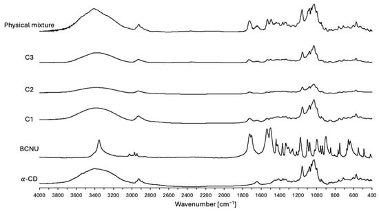 The thermograms of BCNU-α-CD ICs exhibit notable differences that can be linked to their respective preparation techniques. For example, the C2 complex, which was synthesized using a cryogenic method, lacks any identifiable endothermic peaks. A closer analysis of this thermogram reveals two broad peaks at maximum temperatures of 82.4 °C and 194.0 °C, which are similar to those found in pure α-CD, indicating a lack of effective complex formation between the drug and the cyclodextrin. Conversely, the complex obtained through mortar grinding shows a slight peak at a maximum of 87.9 °C and a more significant peak at 173.6 °C, along with an endothermic effect measured at 10.04 J/g. Notably, the thermogram of the BCNU-α-CD IC derived from the co-precipitation method is the most promising, showcasing three endothermic peaks at a maximum of 148.5 °C, 184.9 °C (with an endothermic effect of 23.4 J/g), and a further peak at 189.6 °C. The observed shift in the peak associated with free α-CD, originally at 197.4 °C, to a lower temperature indicates that the disordering of the lattice has occurred, which might be caused by the BCNU-α-CD IC formation []. These results suggested that some of the water molecules bound to α-CD were replaced by BCNU molecules [,,]. The successful incorporation of BCNU into the cavity of α-CD is noteworthy. It is essential to emphasize that the complexes formed did not display a peak indicative of the drug’s Tm. Regrettably, this peak was similarly absent in the thermogram of the physical mixture. Consequently, we opted to validate the formation of the BCNU-α-CD ICs through alternative analytical techniques. In spite of this, the observed changes in thermal effects within the 160–180 °C range for samples C1, C3, and the physical mixture, which relate to the progressive dehydration of α-CD, together with the shifts in enthalpy, may imply the successful formation of ICs. Moreover, the absence of BCNU’s melting peak in the ICs samples acts as compelling proof of the drug’s incorporation into the cavity of α-CD.