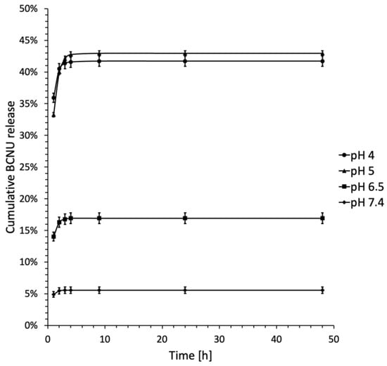 BCNU in vitro release profiles at various pH up to 48 h. Each sample was analyzed in triplicate, and the results are expressed as a mean ± standard error of the mean (SEM).