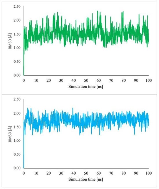 The high value of calculated KF indicates that the interactions occurring between the BCNU and α-CD are relatively strong, exceeding the typically observed values of 10–103 M−1 []. This remarkable value indicates an exceptional structural compatibility between the BCNU and α-CD. In the study performed by Ma et al., the scientists compared the influence of hydroxypropyl--cyclodextrin (HP--CD) and sulfobuthylether--cyclodextrin (SBE7--CD) on the stability and solubility of BCNU. The acquired KF’s from the stability study were equal to 6.3 and 84.0 M−1, respectively []. The results obtained by Ma and colleagues are lower compared to the value provided by our team. The differences may be acknowledged to the types of CDs used. As reported by Sadaquat and Akhtar in the study focusing on complexation of docetaxel with HP--CD, SBE7--CD and native -CD, the stability of formed ICs is indeed highly affected by the type of CD used, with the SBE7--CD exhibiting the highest stabilizing properties (406.41 M−1) and the -CD providing somewhat weaker stabilization (91 M−1) [].