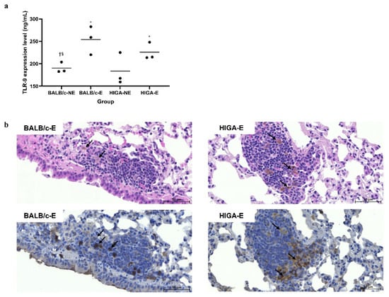 Enzyme-linked immunosorbent assay (ELISA) results revealed that Toll-like receptor 9 (TLR9) expression in the left lung of the PM-exposed (E) groups (BALB/c-E and HIGA-E) was significantly increased compared with that in the PM non-exposed (NE) groups (BALB/c-NE and HIGA-NE; Figure 1a). Hematoxylin and eosin (H&E) staining of lung tissues from BALB/c and HIGA mice revealed pigmented macrophages in E groups (BALB/c-E and HIGA-E) and an increased number of surrounding inflammatory cells. Furthermore, immunohistochemistry (IHC) staining revealed TLR9 expression in the pigmented macrophages (Figure 1b).