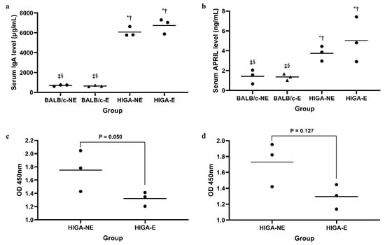 Serum IgA levels were significantly higher in the HIGA groups (6069 ± 493 μg/mL and 6743 ± 758 μg/mL in the HIGA-NE and HIGA-E groups, respectively) than in the BALB/c groups (699 ± 69 μg/mL and 644 ± 70 μg/mL in the BALB/c-NE and BALB/c-E groups, respectively; Figure 2a). Similarly, the serum A Proliferation-Inducing Ligand (APRIL) levels were notably higher in the HIGA groups (3.75 ± 0.75 ng/mL and 5.04 ± 2.27 ng/mL in the HIGA-NE and HIGA-E groups, respectively) than in the BALB/c groups (1.42 ± 0.70 ng/mL and 1.35 ± 0.32 ng/mL in the BALB/c-NE and BALB/c-E groups, respectively), with a tendency for the highest levels to occur in the HIGA-E group (Figure 2b).