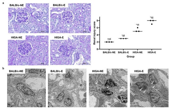 Comparison of pathology and renal injury score in kidney tissue. (a) Periodic acid–Schiff (PAS)-stained kidney tissues from BALB/c and HIGA groups. The BALB/c groups showed no significant glomerular changes, whereas the HIGA groups displayed marked mesangial expansion and mesangial cell proliferation. Glomerular sclerosis was frequently observed in the HIGA-E group, which had the highest renal injury score, followed by the HIGA-NE group. * p < 0.05 compared with the BALB/c-NE group; † p < 0.05 compared with the BALB/c-E group; ‡ p < 0.05 compared with the HIGA-NE group; § p < 0.05 compared with the HIGA-E group. Scale bars: 50 μm. (b) Transmission Electron Microscopy (TEM) images of glomeruli. No mesangial electron-dense deposits were observed in the BALB/c groups; however, they were observed in the HIGA groups (arrows). Scale bars: 2 μm.