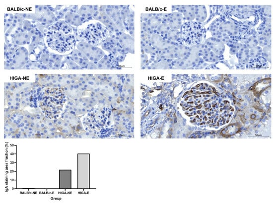 IHC of the kidney tissues revealed no significant IgA deposition in the glomeruli of the BALB/c groups. However, mild mesangial IgA deposition was observed in the HIGA-NE group, and strong mesangial IgA deposition was observed in the HIGA-E group. The IgA staining area fraction per glomerulus was 21.9% in the HIGA-NE mice and significantly greater (40.4%) in the HIGA-E mice (Figure 4).