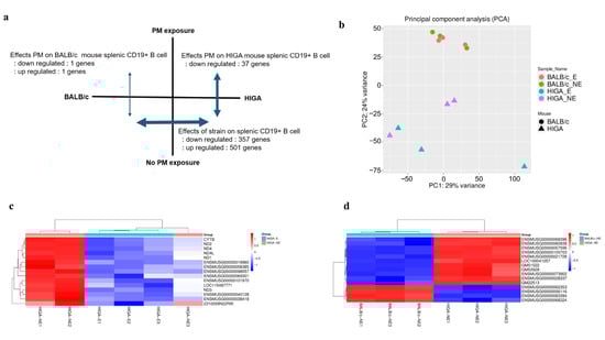 Principal component analysis (PCA) (Figure 5b) confirmed a clear separation by strain and partial segregation according to PM exposure. Heatmaps of representative differentially expressed genes (DEGs) further illustrated distinct gene expression signatures between strains (Figure 5c) and within HIGA mice after PM exposure (Figure 5d).