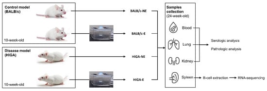 Study design. Overview of the experimental setup. The study involved control (BALB/c) and disease model (HIGA) mice, all of which were 10 weeks of age at the start of the experiment. Each group was divided into two subgroups: NE and E to PM. After a one-week acclimation period, PM exposure occurred for 1 h daily, 5 days per week, for 13 weeks. At 24 weeks of age, mice were euthanized, and blood, lungs, kidneys, and spleen were collected for analysis. Blood, lung, and kidney samples were analyzed for serologic and pathological changes, while spleens were processed for B cell extraction and RNA-seq to assess differential gene expression.