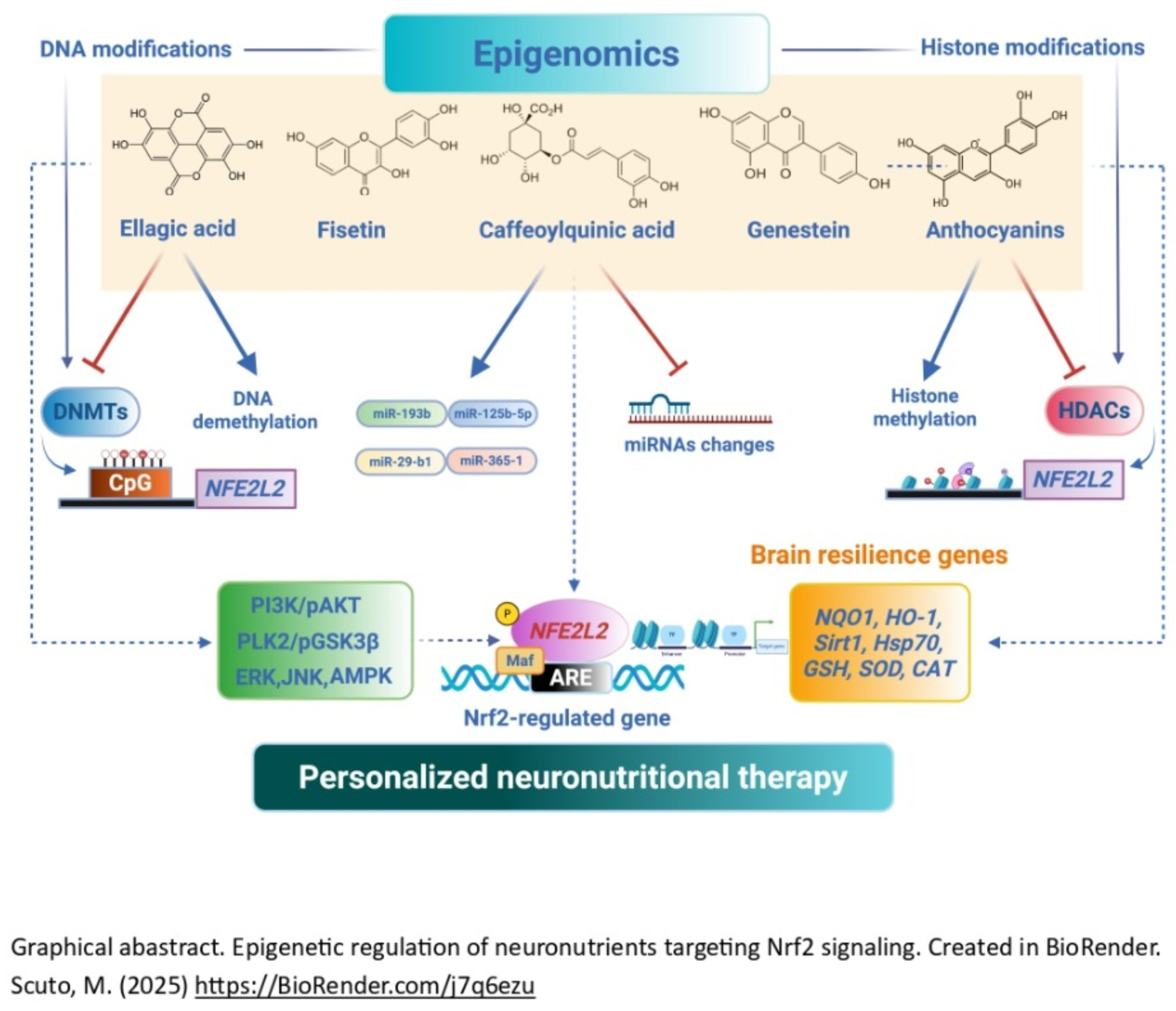 The evolution of the “food as healing medicine” paradigm reflects a broader shift in nutritional science toward proactive, health-oriented dietary strategies. Consistent with this, food is not only a source of energy and essential nutrients but also a potential vehicle for disease prevention and therapeutic intervention [1]. From this new perspective, adopting a personalized neuronutritional approach can identify specific epigenetic profiles and brain resilience targets, thus helping to restore the impaired Nrf2 signaling pathway [3].