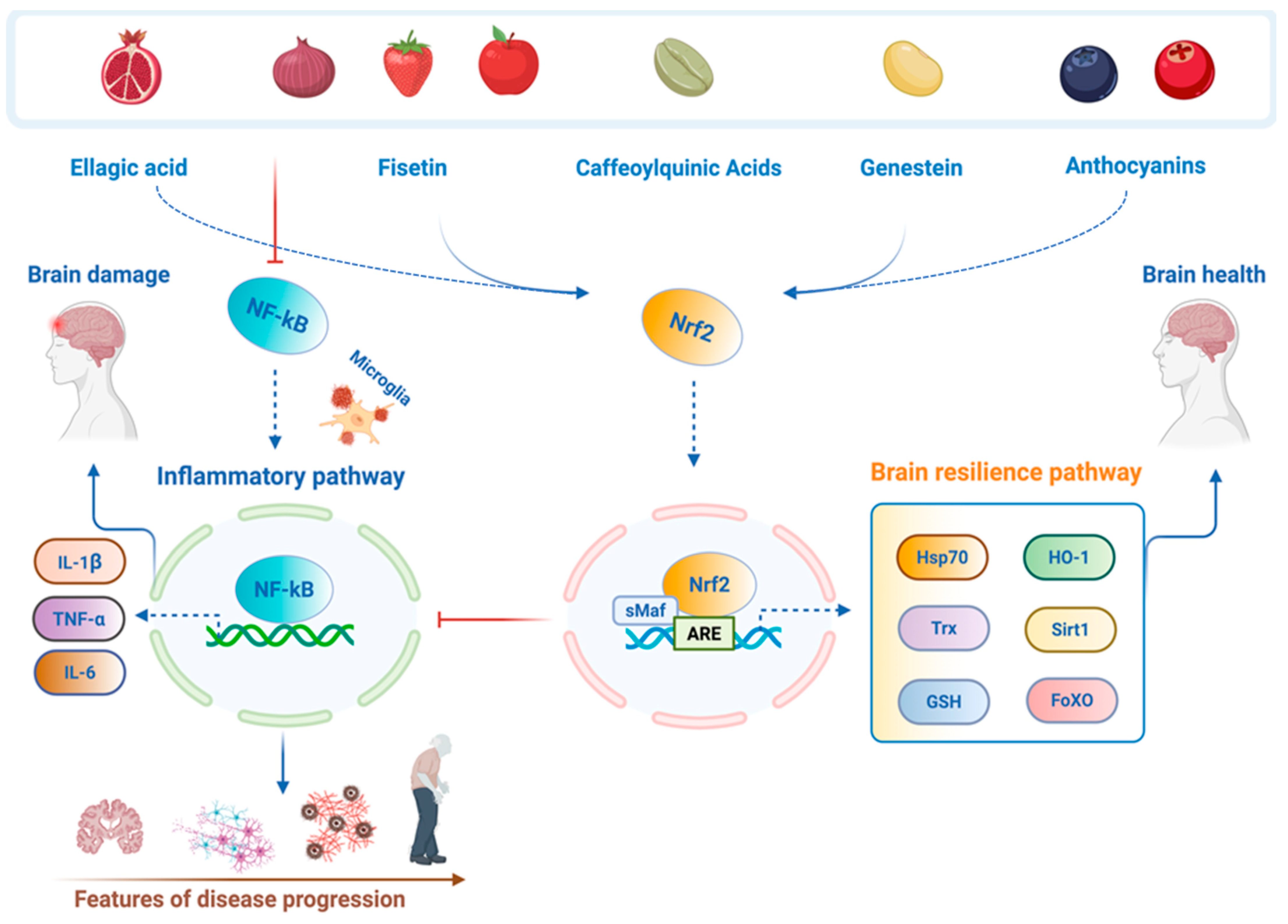 Recent research integrates epigenomic and metabolomic data to understand how genes influence individual nutritional needs and disease susceptibility [27]. This will allow us to characterize vulnerable individuals to biologically resilient individuals to environmental challenges, such as centenarians, who serve as models of longevity and healthy aging [27]. Neuronutrients, including ellagic acid, anthocyanins, caffeoylquinic acid, fisetin, and genistein protect neurons against injury and disease in a dose-dependent manner. Recent preclinical and clinical studies observed that a sub-toxic dose of food nutrients such as flavonoids and their metabolites can trigger adaptive neuronal stress responses driven by the modulation of resilience genes [1,3,24]. For this purpose, activating Nrf2 pathway and brain resilience phase II genes, neuronutrients may potentially prevent or mitigate environmental challenges, namely oxidative stress and neuroinflammation, thus preserving brain health and counteracting the initiation and progression of NDs and neuropsychiatric diseases [25]. Therefore, we propose this neuronutritional approach as part of personalized medicine to apply preventive and therapeutic interventions in neuropathological conditions, mainly concerning AD, PD, and autism. All these pathologies are rooted in altered neuroadaptation to stress [28].