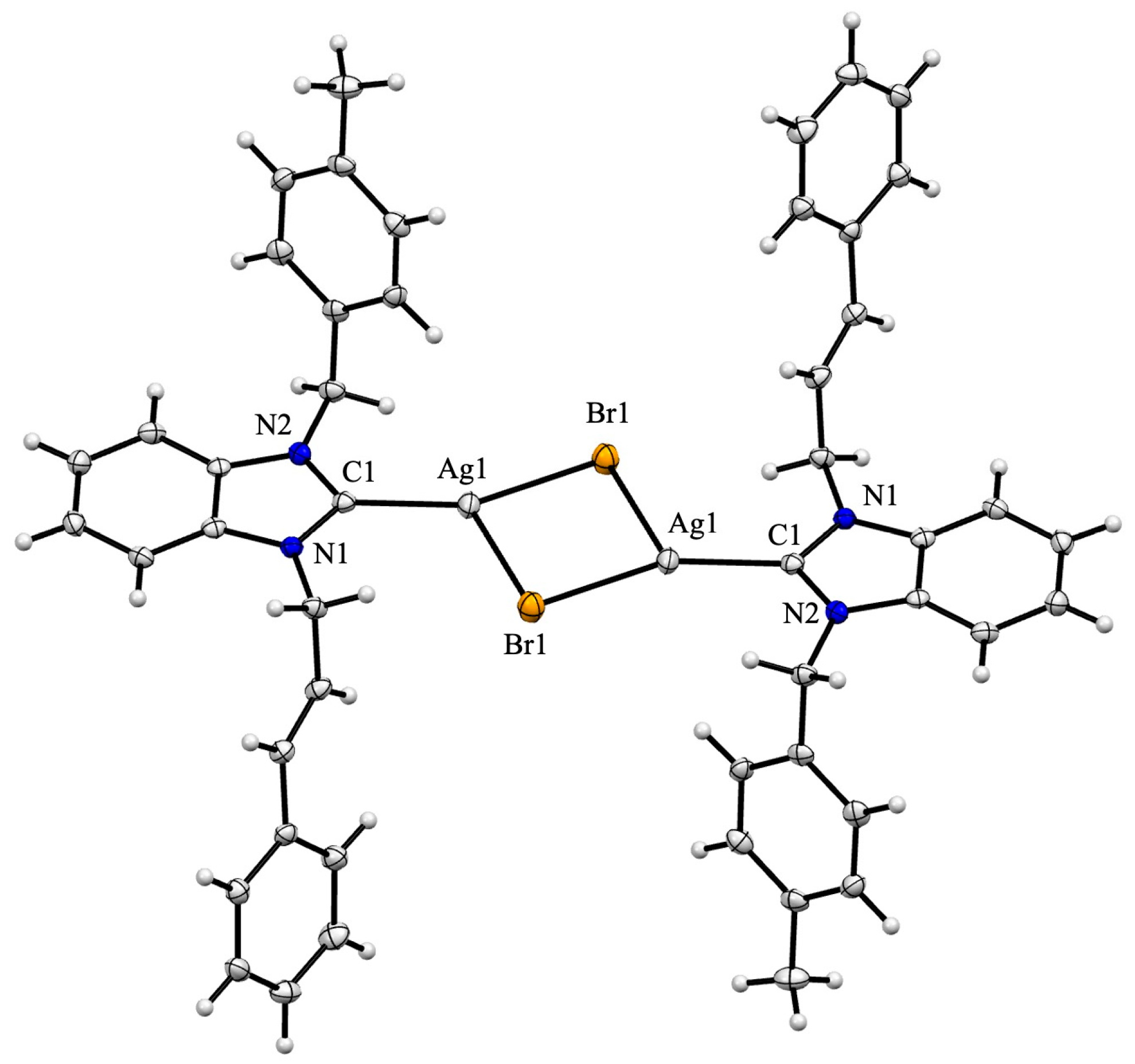 3.3.2. Bromo[1-(4-methylbenzyl)-3-cinnamyl-benzimidazol-2-yliden]silver(I) (1b)