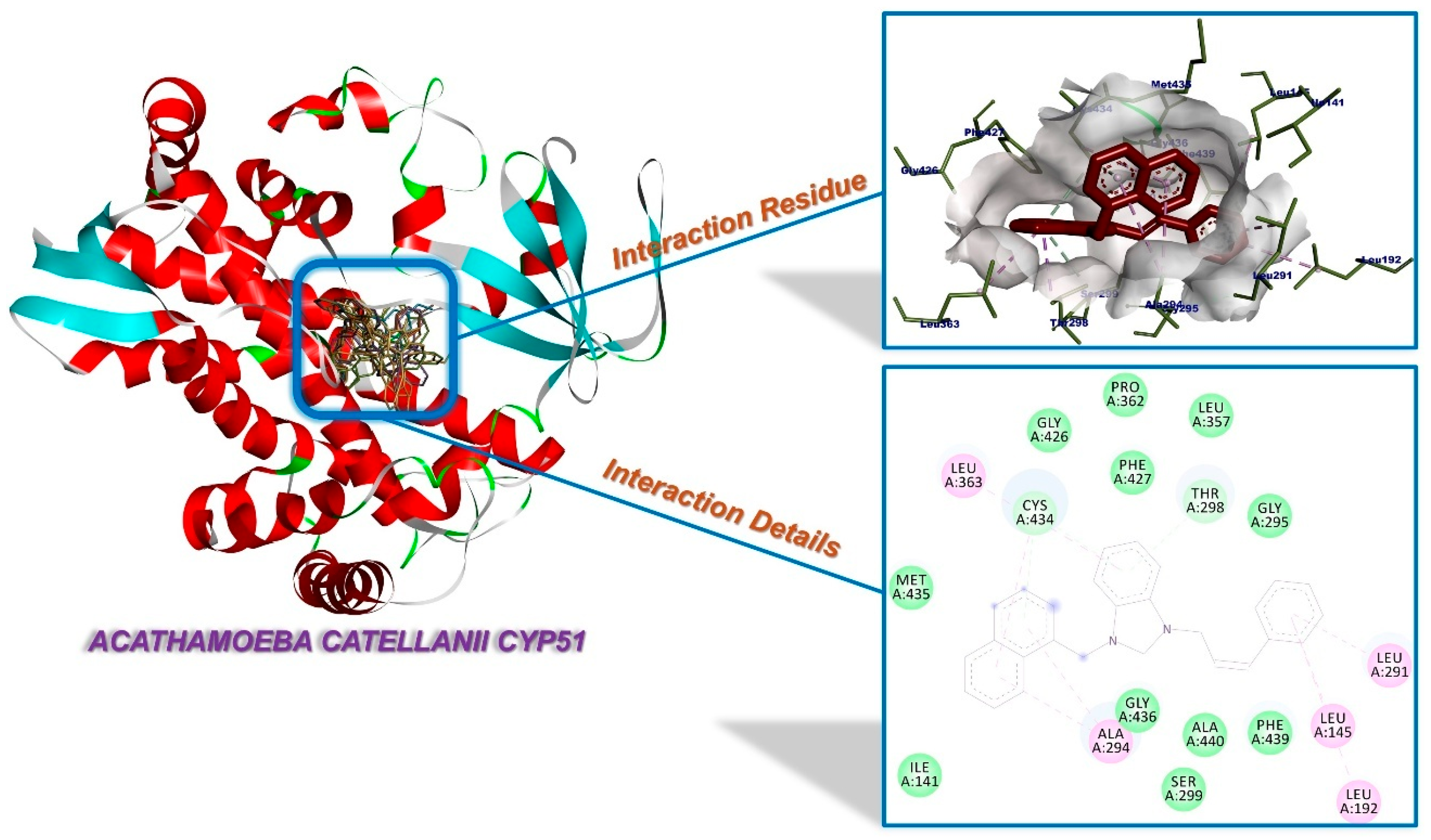 - Hargrove, T.Y.; Lamb, D.C.; Wawrzak, Z.; Hull, M.; Kelly, S.L.; Guengerich, F.P.; Lepesheva, G.I. Identification of potent and selective inhibitors of Acanthamoeba: Structural insights into sterol 14α-demethylase as a key drug target. J. Med. Chem. 2024, 67, 7443–7457. [Google Scholar] [CrossRef]