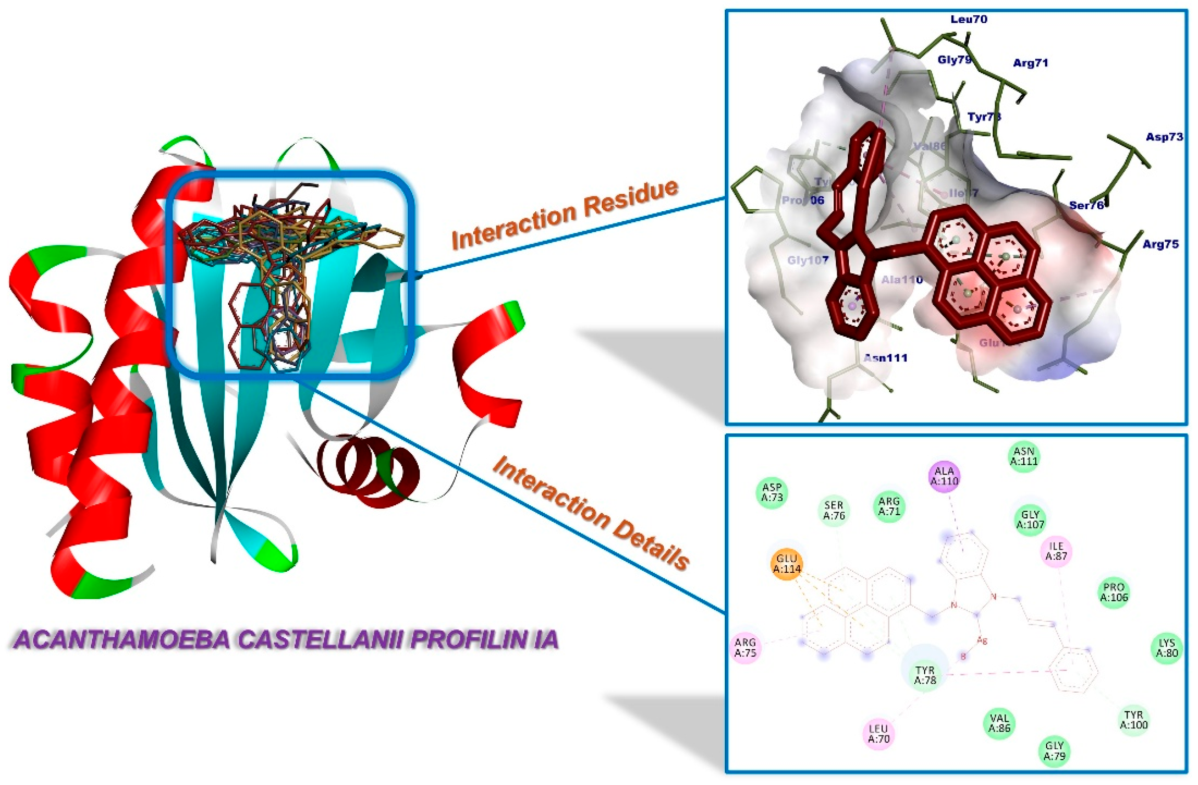 Compounds | Binding Affinity (kcal/mol) | Amino Acids Residue A. castellanii Profilin IA |