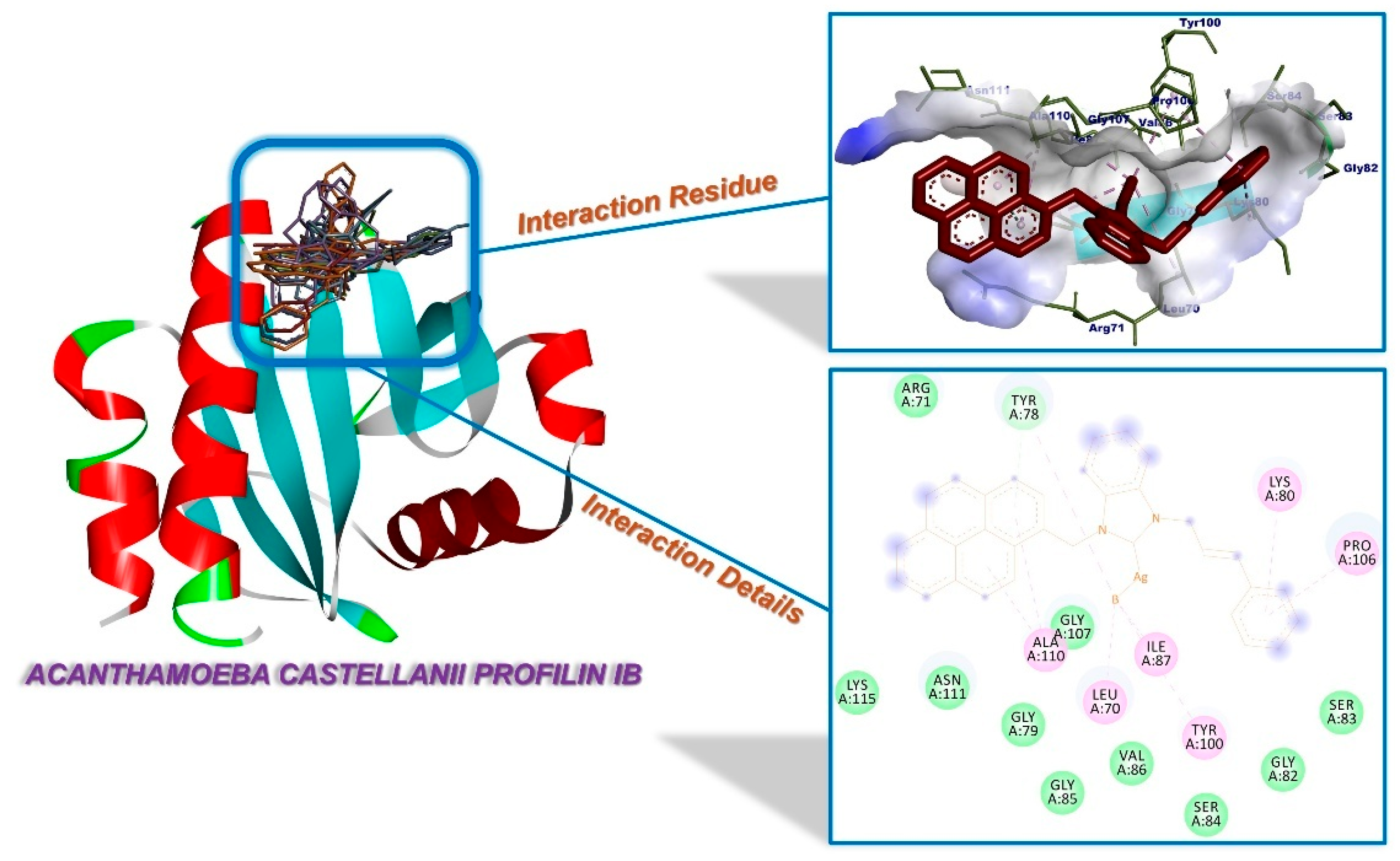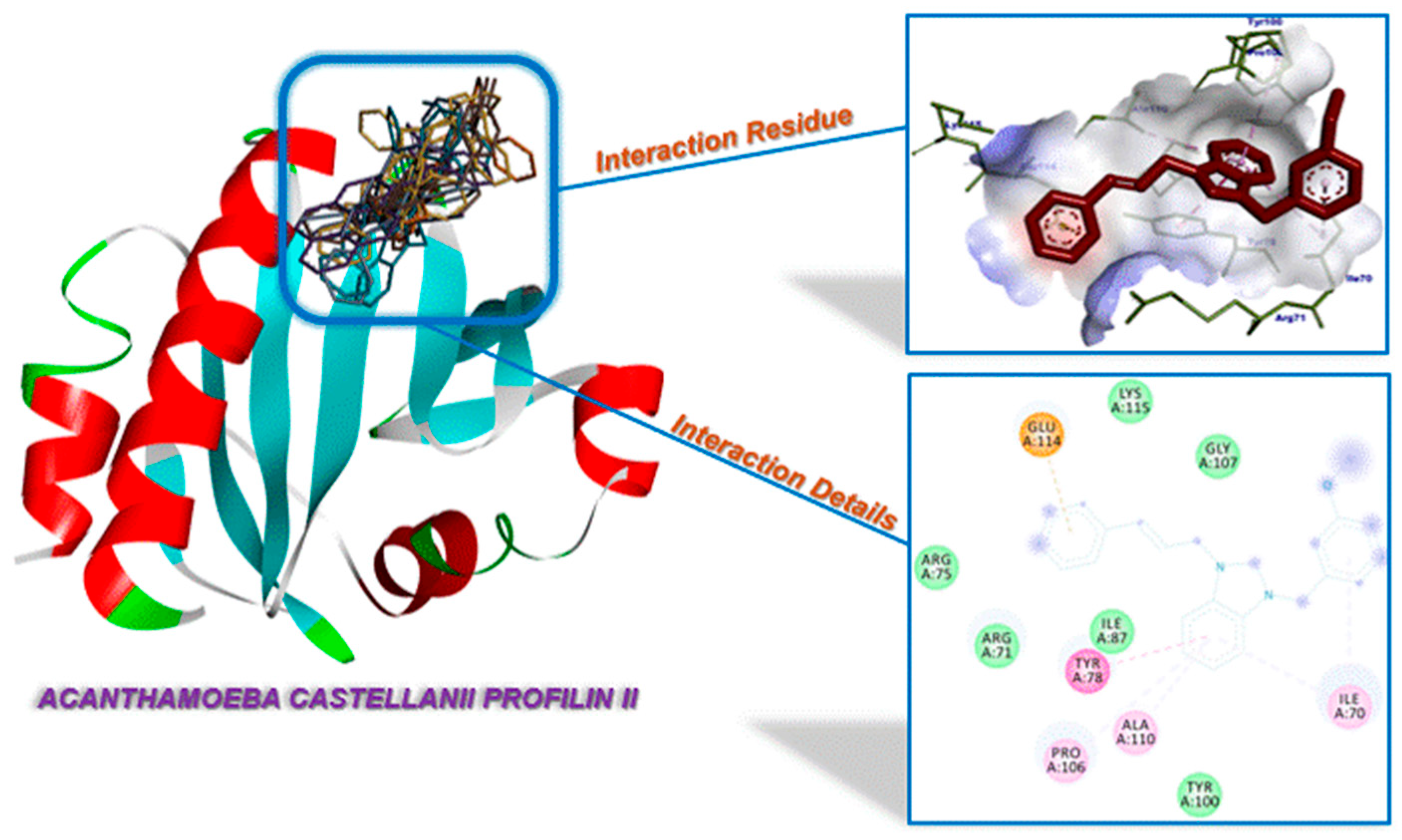 - Kurian, T.; Sebastian, R. Molecular docking study of heterocyclic compounds for antifungal activity against Granulomatous Amoebic Encephalitis. J. Pharm. Res. 2024, 23, 175. [Google Scholar] [CrossRef]