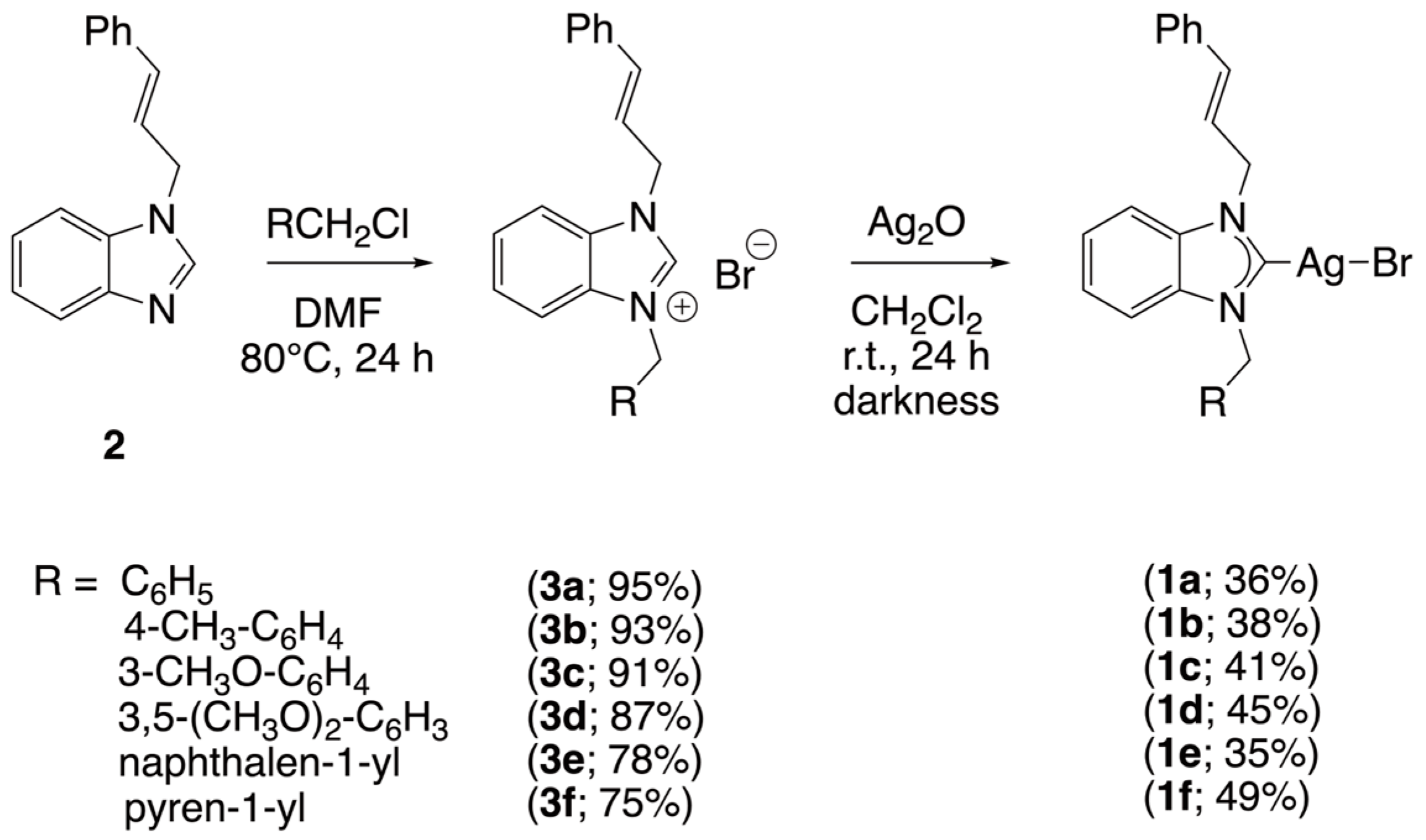 3.3.1. Bromo(1-benzyl-3-cinnamyl-benzimidazol-2-ylidene)silver (I) (1a)