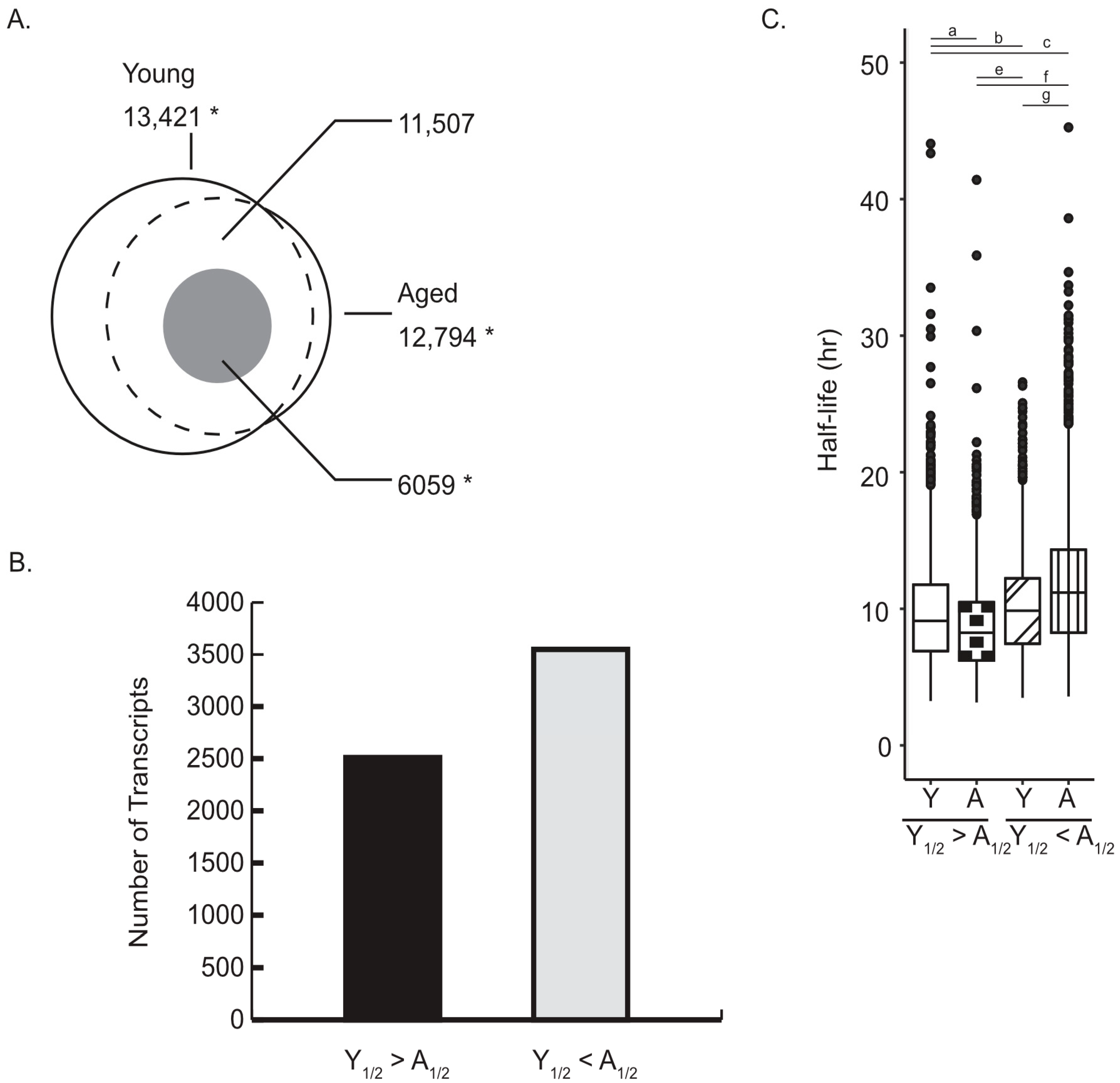 Figure 1. Reproductive aging alters mRNA half-life during oocyte in vitro maturation. (A) Venn diagram showing the number of protein-coding transcripts in reproductively young (<30 years; 13,421) and aged (≥40 years; 12,794) oocytes that fit an exponential decay model (p < 0.05, t-test). The dotted overlap represents the 11,507 shared transcripts present in both groups, and the gray overlay highlights the 6059 shared transcripts with significantly different half-lives between age groups (* p < 0.05, z-test). Transcripts with shorter half-life in aged oocytes satisfy Y1/2 > A1/2, whereas those with longer half-life in aged satisfy Y½ < A½ (see panel (B)). (B) Bar chart showing direction of half-life changes for the 6059 differentially stable transcripts. The 2510 transcripts with a half-life (1/2) that is greater in young (Y) versus aged (A; i.e., Y1/2 < A1/2) are depicted by the black bar): these transcripts have shorter half-lives in aged oocytes. The 3549 transcripts that have longer half-lives in aged oocytes Y1/2 < A1/2 are depicted by the gray bar ( KS test p < 0.05 for indicated comparisons; a, b, c, e, f, g). (C) Boxplots comparing half-life distributions for each group in young (Y) and aged (A) oocytes. For transcripts with Y1/2 < A1/2, median half-life decreased from 9.1 h (Y) to 8.2 h (A). For transcripts with Y1/2 < A1/2, median half-life increased from 9.9 h (Y) to 11.2 h (A).