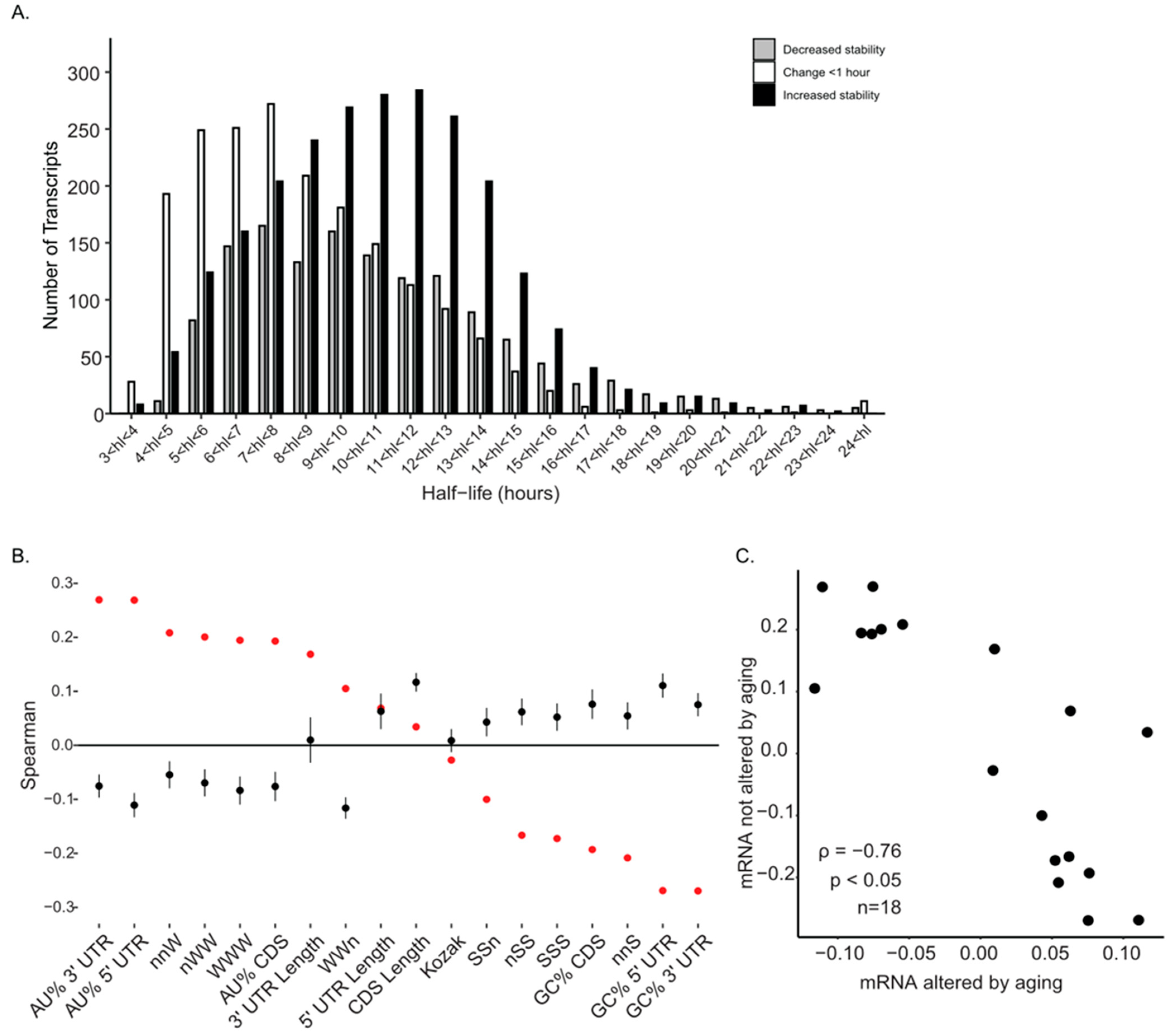 We next performed a correlation analysis between mRNA sequence features and mRNA half-life to identify the drivers of these stability patterns. For transcripts whose stability was unaffected by aging, we observed a strong and positive correlation between AU-rich features (including AU content in the UTRs and AU-containing codons) and mRNA half-life. Conversely, GC-rich features were negatively correlated with half-life in this group (Figure 2B, red dots). In striking contrast, this relationship was inverted for the population of transcripts whose mRNA half-life was altered by aging. In this group, GC content became positively correlated with stability, while AU content showed a negative correlation with half-life (Figure 2B, black dots). This fundamental shift in stability rules was statistically significant, as the correlation patterns between the unchanged and altered transcript groups were strongly and negatively related (ρ = −0.76, p < 0.05, Spearman; Figure 2C).