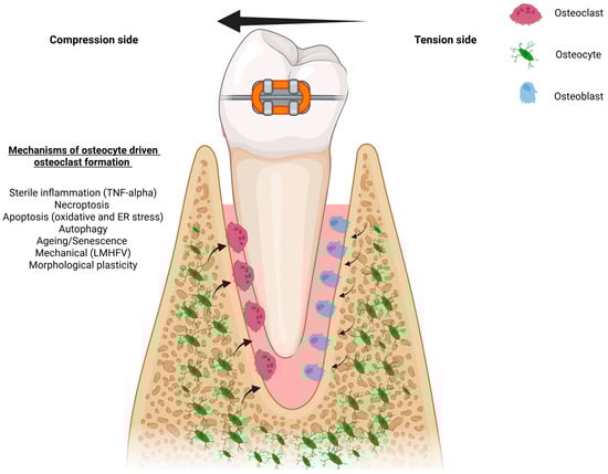 Senescent osteocytes exhibit a reduction in the number of dendritic processes, which compromises the osteocyte network connectivity and mechanotransduction efficiency [80]. Senescent osteocytes are more spherical, small, and accompanied by cytoplasmic lysis, empty cytoplasm, and nuclear abnormalities [81]. These changes coincide with a 30% decrease in lacunar volume and a marked decline in lacunar density, suggesting widespread osteocyte loss in senescent tissues [82,83,84]. Moreover, aging bones show hypermineralized occluded lacunae, a process known as micropetrosis, indicating osteocyte death and mineral infill of empty lacunae [83,85]. These structural changes, together with disrupted perilacunar remodeling, reduce osteocyte sensitivity to mechanical stimuli, impairing their ability to detect orthodontic forces and regulate remodeling responses. Although direct studies of osteocyte aging in OTM are lacking, clinical and experimental data strongly support age-associated impairment in tooth movement. Adults exhibit slower rates of OTM compared to adolescents despite showing an elevated inflammatory profile, including TNF-α and osteoclast-related markers, including RANKL and matrix MMPs, indicating that the downstream bone remodeling machinery is blunted [75]. Adult patients have been reported to have reduced OTM response alongside increased discomfort, suggesting a disconnect between inflammation and effective remodeling [86]. It has been shown that aged rats showed reduced expression of autophagy-related proteins and elevated senescence markers. Pharmacological activation of autophagy with rapamycin restored osteoblast and osteoclast activity, enhanced osteogenic markers, and significantly improved OTM efficiency, highlighting the interplay between senescence, autophagy, and osteoblast-osteoclast interaction in OTM [87]. Aging also induces broader impairments: increased senescence in PDL cells, decreased vascularity, lower regenerative capacity, and a hyperinflammatory environment. Alveolar bone in aged animals demonstrates greater mineral density but reduced responsiveness to mechanical stress, linked to impaired activation of osteoclasts and osteoblasts. Additionally, osteoclastogenesis in aged animals is less responsive to RANKL and TNF-α stimulation, further compounding the remodeling deficit [71]. Despite substantial work on osteoblasts, osteoclasts, and PDL cells, the contribution of osteocyte aging to these phenomena remains underexplored. Given their central role as mechanosensors and regulators of both bone formation and resorption, it is highly plausible that dysfunctional osteocytes contribute significantly to the diminished responsiveness seen in older individuals undergoing orthodontic treatment. The discussed evidence suggests that aging reduces osteocyte viability, dendritic connectivity, and mechano-transduction. These deficits may impair force perception and downstream coordination of bone remodeling during OTM. However, direct experimental evidence on how osteocyte senescence leads to decreased resorption and OTM is required (Figure 1).