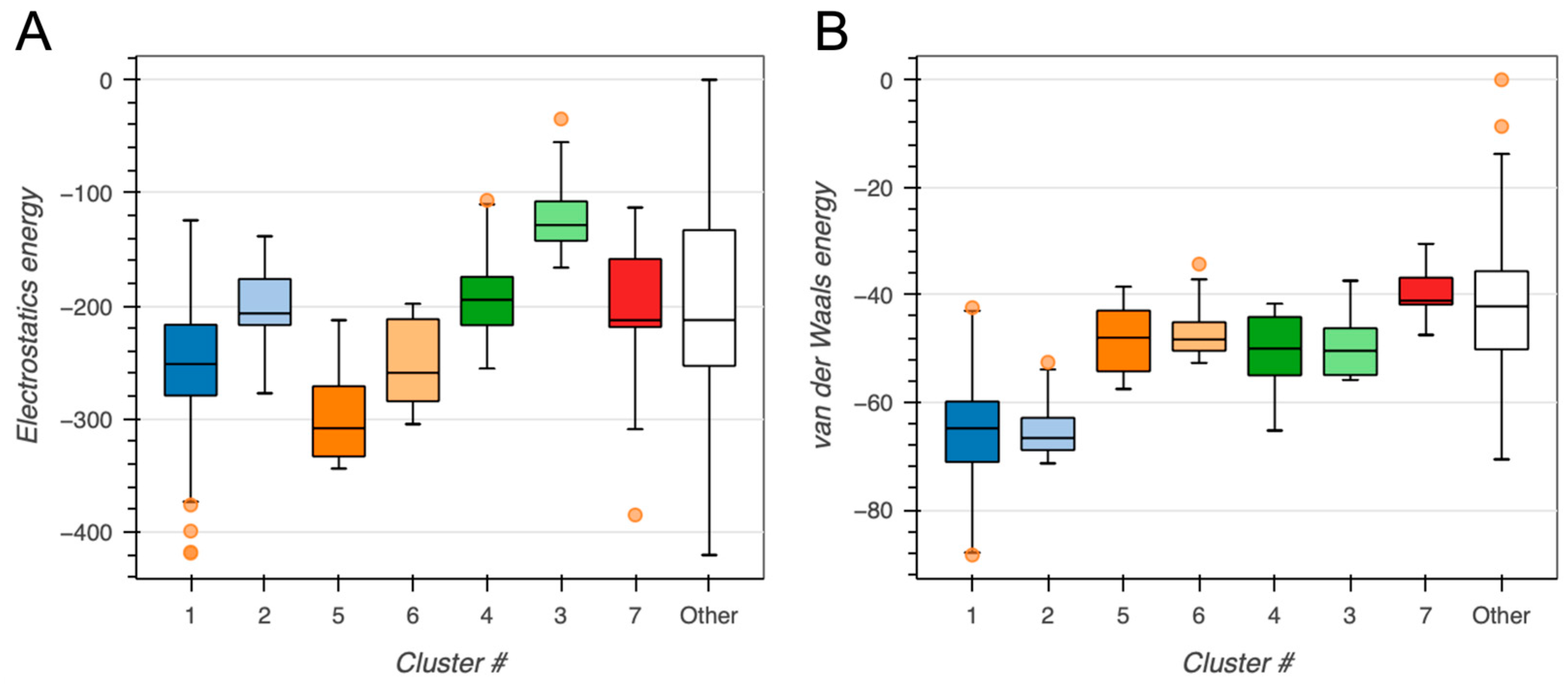 Electrostatic energy (kcal/mole) | −353.5 ± 23.2 | −296.6 ± 35.0 | −323.0 ± 18.6 | −232.9 ± 46.9 |
