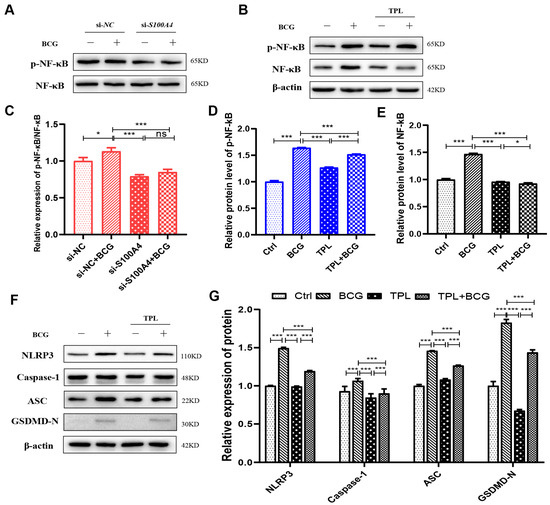 Knockdown of S100A4 inhibited the NF-κB signaling pathway and reduced the expression of NLRP3 inflammasome and pyroptosis-related proteins. (A,B) si-S100A4 downregulated the expression of p-NF-κB. The protein expression levels of p-NF-κB and NF-κB were analyzed using Western blot in the THP-1 macrophages pre-treated with si-S100A4 for 24 h and infected with BCG for 24 h subsequently. (C–E) The protein expression levels of p-NF-κB and NF-κB in the THP-1 macrophages, which were pre-treated with Triptolide (TPL) 5 nM for 2 h and infected with BCG for 24 h, were quantitatively analyzed using Western blot. (F,G) Inhibition of NF-κB decreased the expression of inflammatory-related proteins (NLRP3, Caspase-1 p48, ASC) and a pyroptosis-related protein (GSDMD-N). Data are from mean ± SD of three independent experiments, ns p > 0.05, * p < 0.05, *** p < 0.001.