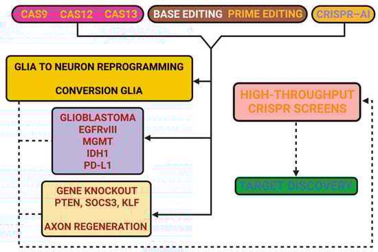 CRISPR technologies have moved beyond blunt genetic scissors to programmable platforms that interrogate DNA, RNA, and chromatin at scales approximating the natural limitations of neural tissue. Their deployment in intrinsic inhibition and glial and naïve reprogramming, and barriers in the extracellular matrix, mitochondrial dysfunctions, and tumor microenvironments have potential examples of depth and scope []. The adoption of high-throughput CRISPR screening technologies has yielded systematic maps of regenerative competency that identify any transcriptional regulators, signaling pathways, and epigenetic programs that are architects of repair competency in a variety of neural systems. These resources provide novel opportunities for the community to more rapidly translate and safely apply advancements in biotechnology into clinical application. With artificial intelligence, it is possible that these artificial devices will go beyond merely blocking inhibition to actually building adaptation states of neuroregeneration []. Although the previous section has identified the principles and applications of CRISPR systems that operate in neural domains, it may be advantageous to provide extensive consideration as a conceptual context for the main platforms presently being explored using Table 2 to show a selection of representative modalities, the mechanistic basis, and one or two example studies for the recent years indicating how distinct strategies for editing could be applied to neuroregeneration and neuro-oncology contexts.