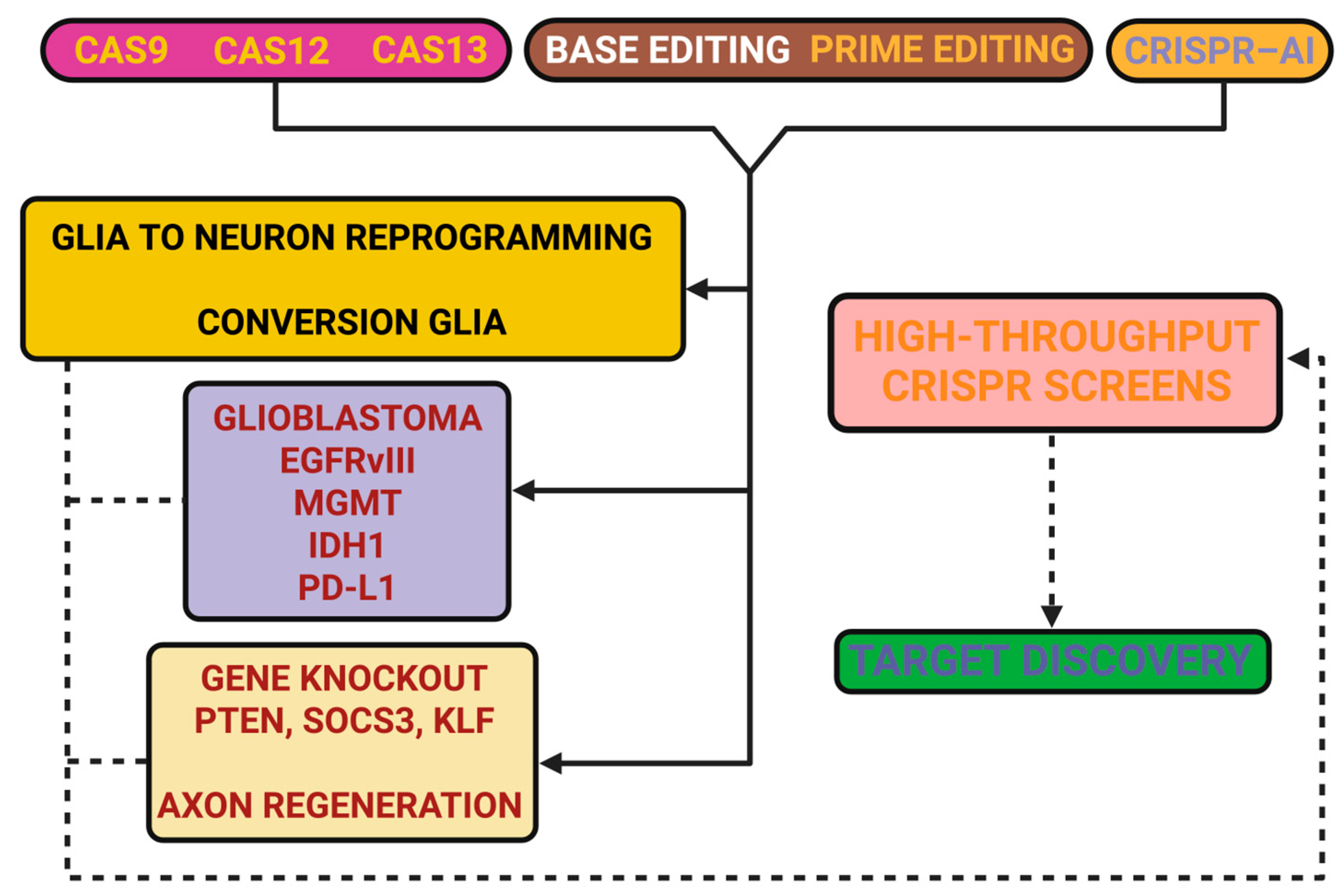 In this regard, we ought to target postsynaptic and presynaptic components of the extracellular interface (PTPσ and LAR chondroitin sulfate proteoglycan receptors, for example), which would ameliorate the inhibitory components of glial scars to treatment. Excitingly, recent reports of CRISPR loss-of function studies documented that deleting (in addition to these proteins) PTPσ, LAR, and others suffices to restore growth cone migration along CSPG-rich matrices [79]. The same scenario could be constructed for the potential limitations of ferroptosis regulators (e.g., GPX4 and FTH1) that may be regulating gene networks activated by macrophages: CRISPR deletion would disrupt lipid peroxidation driven by macrophage infiltration [80,81]. Similarly to this, CRISPR systems using RNA targeting have a similar story, as they can silence maladaptive long non-coding RNAs or microRNAs that stabilize inhibitory circuits (there are some long non-coding RNAs that amplify apoptotic and inflammatory signaling). These are direct modulations in post-transcriptional repression; meanwhile, regeneration must occur in the context of the CRISPR DNA editing interventions altering all dirt [82]. The tumor microenvironment is also a similar domain or target. GBMs employ similar tricks of injury scars: a dampening matrix to keep cells out of their environment, like secreting CSPGs, matrix stiffening, and synaptic takeover. CRISPR directed disarmament of its oncogenic drivers (e.g., EGFRvIII and IDH1-R132H), then a correction of donor genes related to DNA repair (e.g., MGMT), and then disabling of immunosuppressive checkpoints (e.g., PD-L1) all exhibited the ability to disrupt these established tumor resistance programs [83]. Patient-derived GBM stem cell-based CRISPR screens have shown the ability to target both shared dependencies and dependencies that were specific to each subtype of GBM cell type and then multiplexed these interventions to dynamically change their targets in real time to develop into a treatment option [84].