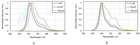 A comparison of the spectra presented in Figure 2 indicated that an increase in the concentration of aryloxy-substituted Zn(II) phthalocyanines results in the broadening of their main fluorescence band and a shift in their emission maximum to longer wavelengths. These effects become particularly evident at a concentration of 100 μM for 4αβZnPc4+ with an asymmetric distribution of charged groups. In the spectrum of 4αβZnPc4+ at 100 μM, the intensity of the long-wave peak in the spectral range of 760–780 nm, corresponding to the aggregate forms of 4αZnPc4+, and, accordingly, its contribution to the integrated fluorescence intensity increases significantly []. Symmetric non-peripheral substitution reduces the effect of aggregation on the phthalocyanine spectra [].