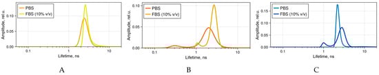 Fluorescence lifetimes distribution of (A) 4αZnPc4+, (B) 4αβZnPc4+, and (C) ZnPcChol8+ solutions in PBS or in PBS with FBS 10% (v/v) obtained using Maximum Entropy Method. Resolvable peaks were considered as individual components of the fluorescence decay. The concentration of phthalocyanines was 10 μM, except for 4αβZnPc4+ in PBS, where it was increased to 100 μM.