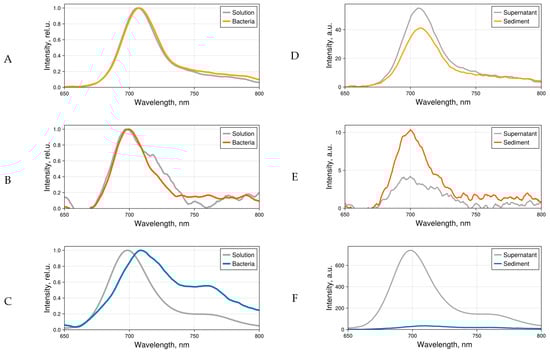Normalized fluorescence spectra (A–C) and fluorescence spectra (D–F) of 4αZnPc4+ (A,D), 4αβZnPc4+ (B,E), and ZnPcChol8+ (C,F) in bacterial sediment and supernatant medium (PBS) after addition of phthalocyanine derivatives (5 µM).