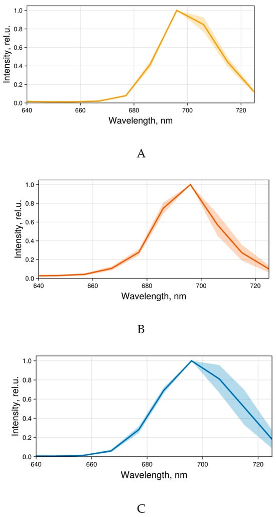 The fluorescence spectra of 4αZnPc4+, 4αβZnPc4+, and ZnPcChol8+ bound to bacteria were registered using the spectral resolution regime of the confocal microscope (Figure 5). The fluorescence spectra of symmetric tetra- and octacationic 4αZnPc4+ and ZnPcChol8+ typically exhibit a broad peak in the range of 696–706 nm. In the spectra of asymmetric 4αβZnPc4+, the fluorescence peak shifts to 686–696 nm. A shorter-wavelength maximum in the fluorescence spectrum of this compound was previously noted in bacterial sediment (Figure 4B).