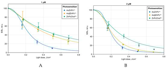 Bioluminescence of E. coli K12 TG1 (luxABCDE) after 10 min incubation with the studied photosensitizers at (A) 1 μM and (B) 2 μM concentration, and further irradiation with red light-emitting diode (LED) 686 nm.