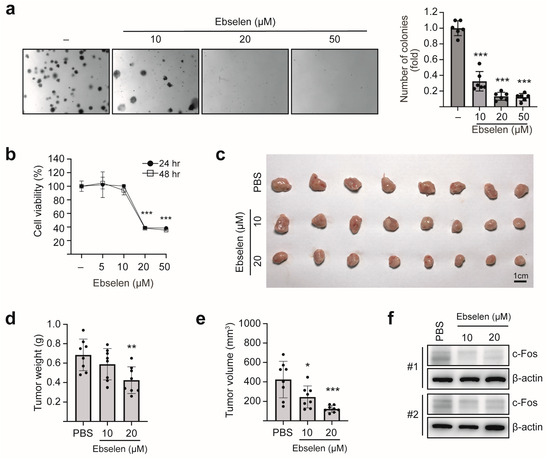 2.6. Ebselen Inhibits Colony Formation and In Vivo Tumorigenesis by Reducing c-Fos Expression