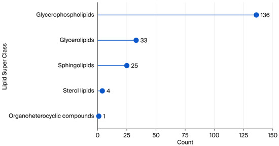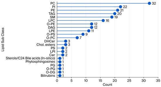The most abundant subclass (Figure 3) was phosphatidylcholines (PCs), with 32 identified compounds, followed by phosphatidylinositols (PIs) (24), phosphatidylethanolamines (PEs) (22), triacylglycerols (TAGs) (21), and sphingomyelins (SMs) (20). It is noteworthy that several other subclasses, including lysophosphatidylcholines (LPCs), ether-linked phosphatidylethanolamines (O-PEs), and diacylglycerols (DAGs), exhibited a range of 12 to 16 identified compounds. Lower-abundance subclasses, such as bilirubins, ether-linked di-acylglycerols (O-DGs), and phosphatidylglycerols (PGs), contained only 1–2 compounds. This distribution is indicative of the chemical diversity of the lipidome. The most prevalent molecular species identified were phospholipids and neutral lipids.