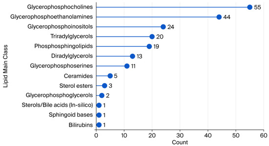 As illustrated in Figure 2, a wide array of primary lipid categories could be identified. The data demonstrated that glycerophosphocholines (54 compounds) and glycerophosphoethanolamines (44 compounds) were the most prevalent classes, followed by glycerophosphoinositols (24), triacylglycerols (TAGs) (20), and phosphosphingolipids (19). A range of 11 to 5 identified compounds was observed in other lipid categories, including diradylglycerols, glycerophosphoserines, and ceramides. It was determined that minor classes, such as bilirubins, sphingoid bases, and sterols/bile acids, comprised only four identified molecules each. These results show a heterogeneous distribution of lipid species, emphasizing the dominance of glycerophospholipids in the measured lipid profiles.