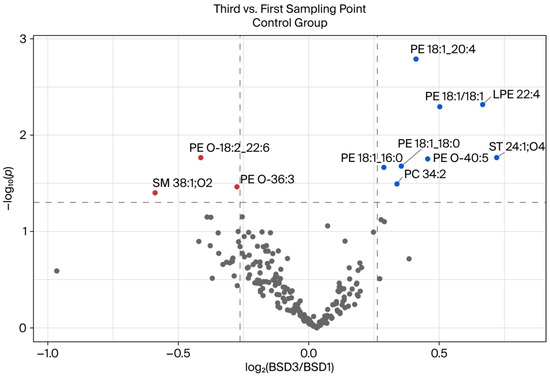Volcano plot showing the differences between blood sampling dates (BSDs) 1 and 3 of the control group. The fold change is set to 1.2, and the significance level is p < 0.05. The lipids that changed significantly in the comparison of the two groups are shown in red (decreased) and blue (increased). All annotated lipids are included. The samples were prepared in duplicate and measured in n = 2.