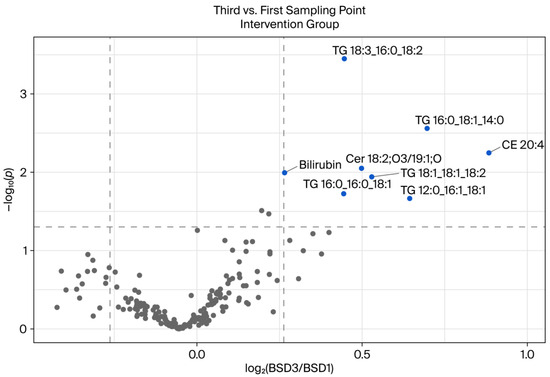 Between the first and third blood sampling dates in the intervention group (see Figure 5), a total of eight lipids demonstrated a significant change of at least 1.2-fold compared to the previous blood sampling date. Notably, all of the altered lipids increased in comparison. These lipids included Cer 18:2;O3/19:1;O, TG 12:0_16:1_18:1, TG 18:3_16:0_18:2, TG 16:0_18:1_14:0, TG 18:1_18:1_18:2, TG 16:0_16:0_18:1, and CE 20:4. Bilirubin levels were also measured, and they exhibited a substantial increase. A notable observation is that, among the eight lipids that exhibited a significant alteration, a total of five lipids belonging to the lipid class glycerolipids and the category of triglycerides or triacylglycerides were identified. The triglyceride TG 18:3_16:0_18:2 demonstrated the most substantial change. Notably, the most substantial change was observed in the lipid CE 20:4. Bilirubin also differed significantly, but the fold change limit was only just about exceeded. Given that bilirubin is not classified as a lipid, it is assigned a subordinate role in the context of lipidomics.