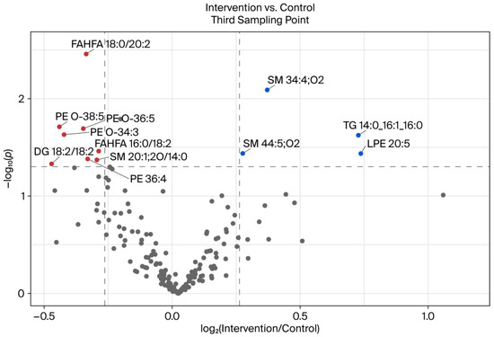 Volcano plot showing the differences between the intervention and control groups at the third blood sampling date. The fold change is set to 1.2, and the significance level is p < 0.05. The lipids that changed significantly in the comparison of the two groups are shown in red (decreased) and blue (increased). All annotated lipids are included. The samples were prepared in duplicate and measured in n = 2.
