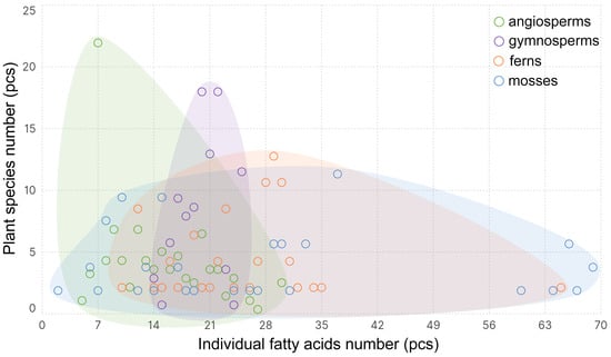 The monocarboxylic acids comprising the lipids of higher plants are represented by 144 individual FAs (iFAs) (Table S1). The iFAs number in individual plant species ranges from 2 to 69 (Figure 1). The greatest variation is observed in mosses, but this is slightly lower in ferns (from 10 to 65) and lowest in gymnosperms (from 14 to 25) and in angiosperms (from 2 to 30). Generally, (median value), there are 28 iFAs in mosses, 27 in ferns, 20 in gymnosperms, and 12 iFAs in angiosperms. Thus, during the evolution of Embryophyta, there is a clear reduction in the composition diversity of iFA lipids.