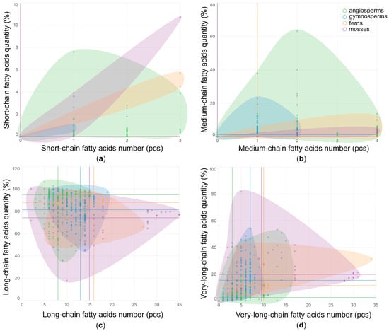 The number of short-chain (a), medium-chain (b), long-chain (c), and very-long-chain (d) fatty acids in different species of Embryophyta clades: mosses, ferns, gymnosperms, and angiosperms. The lines corresponding to the legend colors indicate the median value of the qualitative and quantitative composition of lipid fatty acids with a specific acyl chain length according to the clades.