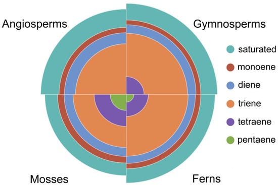 The most striking difference in uFA content is demonstrated by tetraene FAs (tFAs) (Figure 3; Table S2). They are practically absent in angiosperms (median = 0). The presence of tFAs can be called an archaic feature of Embryophyta: the more evolutionarily the ancient tribe, the more tFAs these plants contain (gymnosperms—3.7%, ferns—5%, and mosses—9%). Pentaene FAs (pFAs) are quite rare in the composition of Embryophyta lipids and are completely uncharacteristic of seed plants. In ferns, their median value is 0.7%, with pFAs most commonly being found in mosses at 3%. (Figure 3; Table S2). Hexaene FAs (hFAs) are not typical regarding the lipid composition of Embryophyta, occurring only in certain species of mosses (sp. № 528), ferns (sps. № 455 and № 457), and angiosperms, where the genus Centaurea should be singled out; in Centaurea, six species (sps. № 104, 105, 107, 111, 118, 121) contain gFAs, but these FAs are also found in species № 12, 15, 78, 163, 272, and 300 from various other families (Table A1, and Tables S1 and S2). Bryophytes often produce large amounts of very-long-chain polyunsaturated FAs (VLPUFAs), mainly including 20:4(5,8,11,14) and 20:5(5,8,11,14,17) [26]. The presence of VLPUFAs is characteristic of aquatic organisms such as algae [93,94,95], but it is rarely found in higher plants. This may indicate that the mosses did not completely lose their marine origins when they entered non-aquatic environments [96].