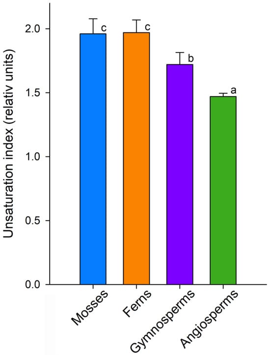 Unsaturation index of various Embryophyta clades: mosses, ferns, gymnosperms, and angiosperms. Values assigned with different letters indicate a significant difference between the medians (one-way ANOVA followed by post hoc Tukey’s NHSD test, p < 0.05).