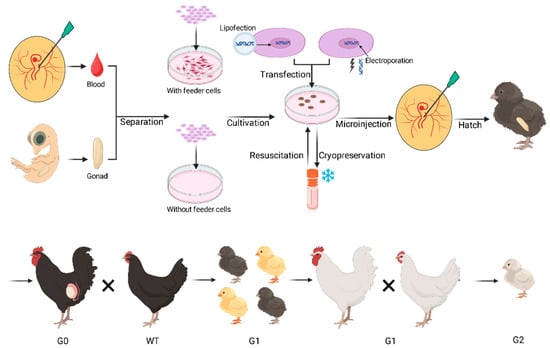 For generating germline chimeras, PGCs can be isolated from three primary sources: the early-stage germinal crescent, embryonic blood, and embryonic gonads. Although technically feasible, isolating PGCs from the germinal crescent (stages 4–8) is inefficient due to the low cell numbers. Consequently, current methodologies predominantly rely on two sources that offer higher yields: circulating PGCs harvested from embryonic blood (stages 13–15) and gonadal PGCs (gPGCs) isolated from primordial gonads after they have completed their migration (stages 27–29) [40]. For instance, Yu et al. achieved a 12.6% chimerism rate by transplanting blood-derived PGCs between chicken strains [41]. The versatility of this approach is further highlighted by successful interspecies transplantation, such as transferring pheasant PGCs into chicken embryos [42] or chicken PGCs into quail embryos [43], demonstrating their robust migratory and colonization capabilities. Comparative analyses have also shown that blood-derived PGCs may exhibit superior migration potential compared to those sourced from gonads [44].