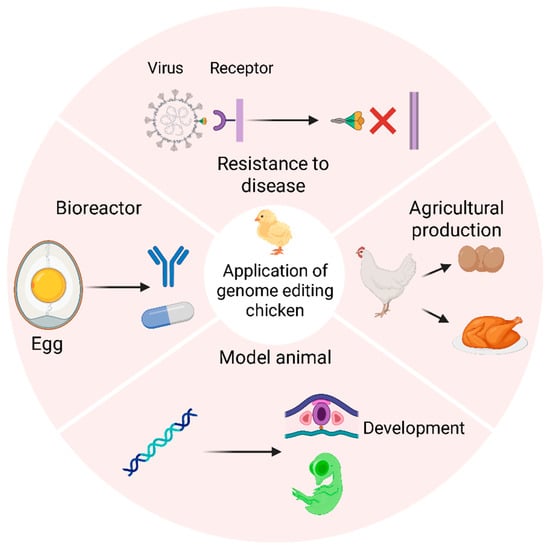 Advances in avian cell biology and genome editing have enabled the creation of genetically engineered birds, thereby validating the efficacy of these new molecular tools. These efforts are a prerequisite for translating research into commercial applications. In intensive poultry farming, infectious disease outbreaks pose a catastrophic economic risk, making disease resistance a primary research objective. Concurrently, enhancing production traits, such as muscle growth and egg characteristics, offers significant commercial value. The development of specialized animal models, including sterile avian hosts, accelerates research and reduces costs by improving the efficiency of generating transgenic offspring. Finally, the unique ovipositional biology of birds makes them ideal candidates for use as living bioreactors for producing therapeutic proteins. This section reviews four major domains of avian genome editing applications: enhancing disease resistance, improving agricultural production, developing novel animal models, and engineering avian bioreactors.
