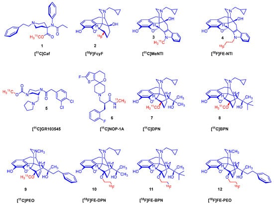The molecular imaging of ORs by positron emission tomography (PET) [,,,,] began four decades ago with the advent of the μ-OR selective agonist ligand [11C]carfentanil (1, [11C]Caf; Figure 1) [] and the μ/κ-OR selective [18F]cyclofoxy ([18F]FcyF, 2) []. Other PET tracers include the δ-selective antagonist naltrindole (NTI) derivatives developed by Lever et al., namely, N1′-[11C]methyl-naltrindole (3, [11C]MeNTI) [] and N1′-(2-[18F]fluoroethyl)naltrindole (4, [18F]FE-NTI, BU97001) []. Ravert et al. [] reported the radiosynthesis of the κ-OR selective agonist arylacetamidopiperazine derivative (R)-(-)-[11C]GR103545 (5) in 1999. Subsequently Pike et al. [] synthesized the labeled NOP (ORL1) ligand [11C]NOP-1A (6).