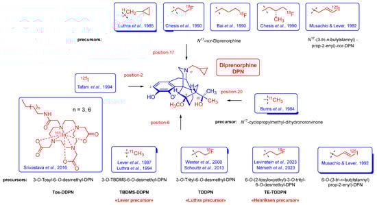 - Levinstein, M.R.; Ventriglia, E.N.; Gomez, J.L.; Budinich, R.C.; Marton, J.; Henriksen, G.; Holt, D.P.; Dannals, R.F.; Pomper, M.G.; Zarate, C.A.; et al. 6-O-(2-[18F]Fluoroethyl)-6-O-desmethyl-diprenorphine ([18F]FE-DPN) preferentially binds to mu opioid receptors in vivo. Mol. Imaging Biol. 2023, 25, 384–390. [Google Scholar] [CrossRef] [PubMed]