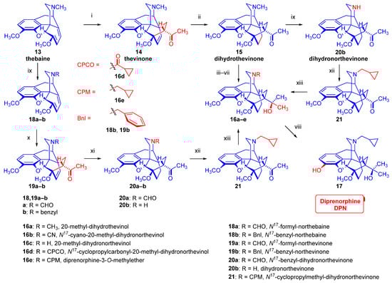In the early 1990s, the Makleit research group developed several alternative routes for the synthesis of diprenorphine, buprenorphine, and their N17-substituted analogs [,]. In the first approach (13 → 18a–b, → 19a–b → 20a–b → 21 → 16e → 17; Figure 3), N17-formyl-northebaine (18a) and N17-benzyl-northebaine (18b) [,] are reacted with methyl vinyl ketone to yield the corresponding cycloadducts, N17-formyl-northevinone (19a) and N17-benzyl-northevinone (19b), respectively. The hydrogenation of 19a in the presence of 10% Pd-C in ethanol (60 °C, 5 bar) gives N17-formyl-dihydronorthevinone (20a), which is converted into dihydronorthevinone (20b) by hydrolysis with HCl/EtOH (reflux, 4 h). Subsequently, 20b is alkylated with cyclopropylmethyl bromide to N17-cyclopropylmethyl-dihydronorthevinone (21). The Grignard reaction of 21 with methylmagnesium iodide in a toluene–diethylether mixture results in 20-methyl-N17-cyclopropylmethyl-dihydronorthevinol (16e) in 94% yield. Thereafter compound 16e is 3-O-demethylated to diprenorphine (17). In the second approach (route: 13 → 14 → 15 → 20b → 21 → 16e → 17; Figure 3), dihydrothevinone (15) is N-demethylated with diethylazodicarboxylate (DEAD) to yield dihydronorthevinone (20b). Analogously to the previous route, dihydronorthevinone (20b) is converted into diprenorphine (17) via N17-alkylation, Grignard addition, and 3-O-demethylation.